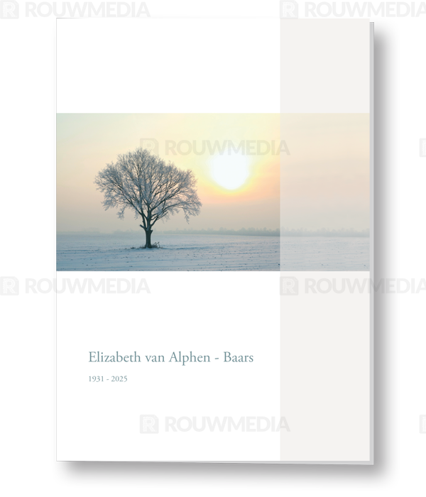 Rouwkaart met afbeelding van een boom in een besneeuwd winters landschap. Aan de rechterkant wordt een transparante balk weergegeven om de kaart wat meer kleur te geven en speelser te maken.