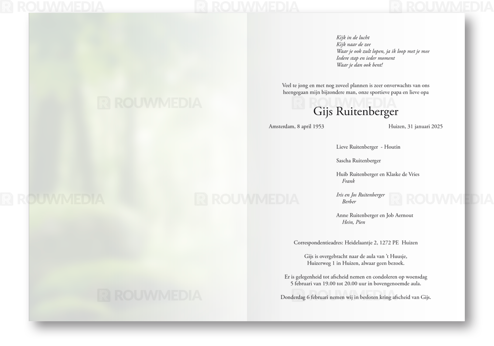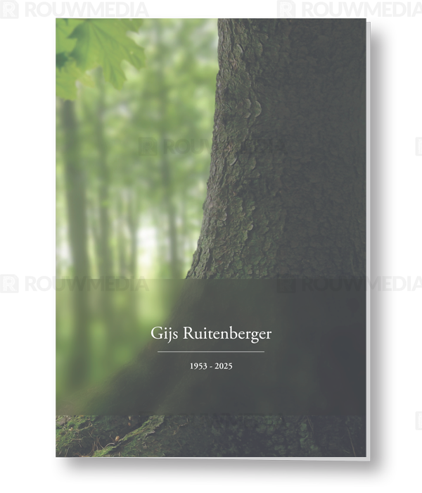 In deze staande rouwkaart wordt een beeldvullende afbeelding weergegeven die geïnspireerd is op de natuur. Over deze afbeelding is een wazige balk geplaatst zodat er ruimte ontstaat om een naam met datum weer te geven.