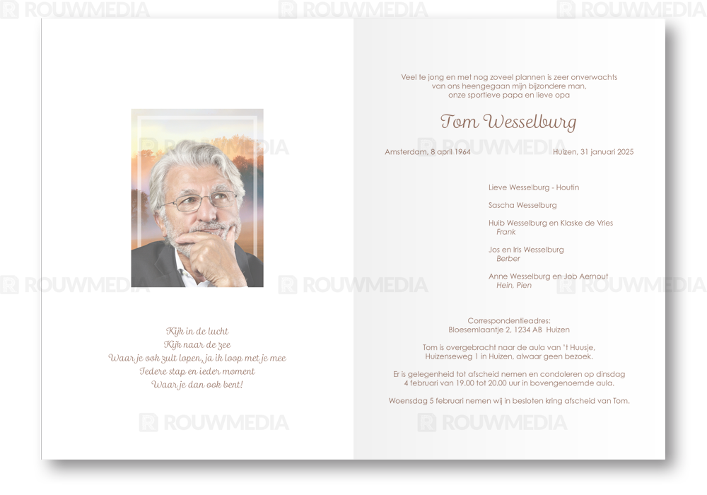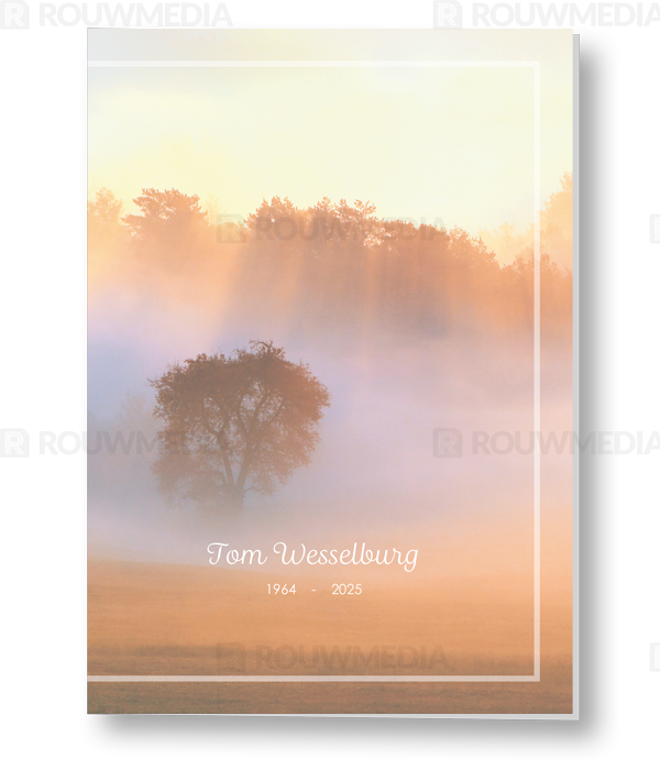 In de staande rouwkaart wordt een beeldvullende foto weergegeven van een boom in een mistig weiland.