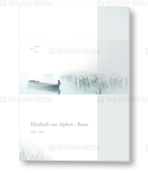 Rouwkaart met afbeelding van de boot op het meer. Aan de rechterkant wordt een transparante balk weergegeven om de kaart wat meer kleur te geven en speelser te maken.