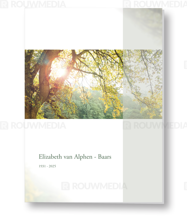 Op deze Rouwkaart tonen we een boom met jong blad dat wordt beschenen door de zon. De Rouwkaart ademt zomer in een bosrijke omgeving. Zeer treffend voor personen die affiniteit hebben met bos en bomen.