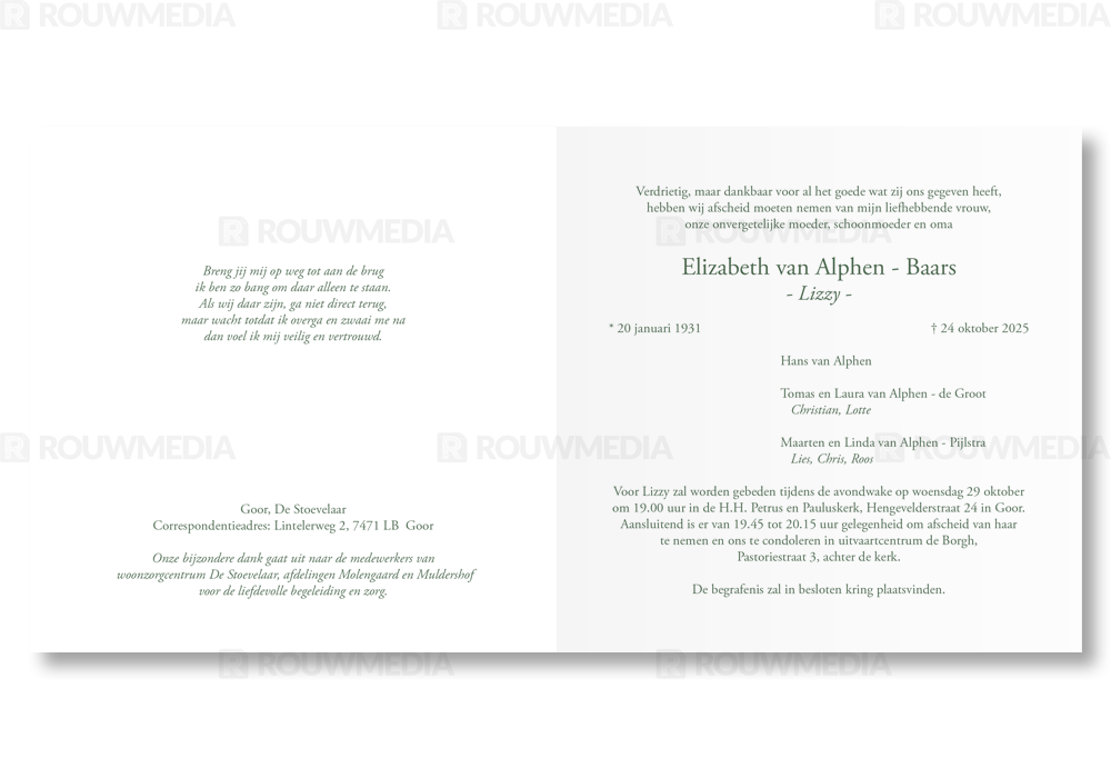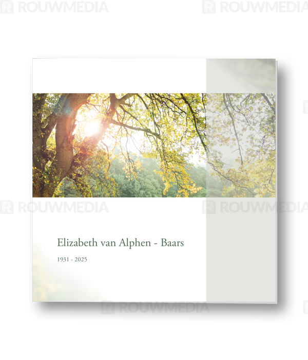 Op deze Rouwkaart tonen we een boom met jong blad dat wordt beschenen door de zon. De Rouwkaart ademt zomer in een bosrijke omgeving. Zeer treffend voor personen die affiniteit hebben met bos en bomen.