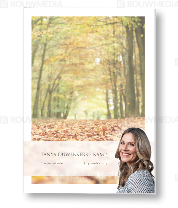In de staande rouwkaart wordt een beeldvullende foto weergegeven van bospad in de herfst. Daarnaast is het mogelijk om een portret/foto naar eigen keuze rechts weer te geven naast de naam en datums.