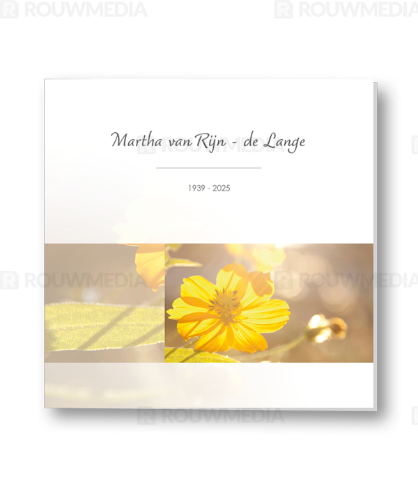 Op deze staande rouwkaart wordt een boterbloem weergegeven. Daarboven is het mogelijk om een naam met datums weer te geven.