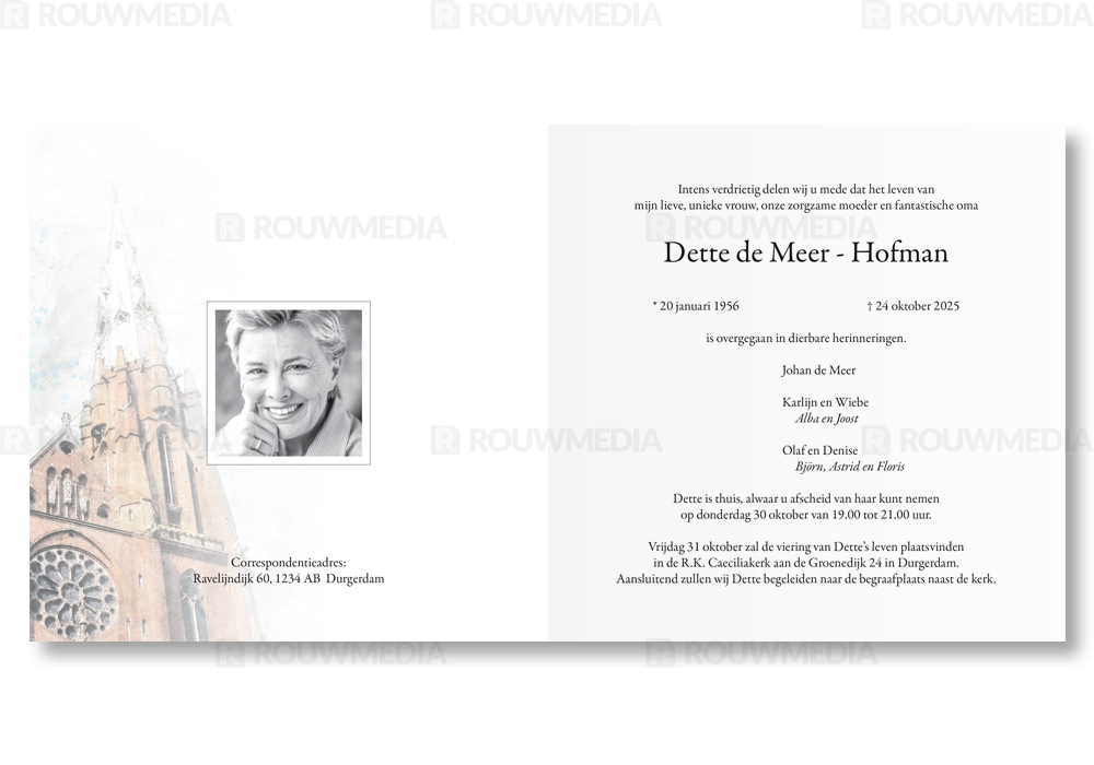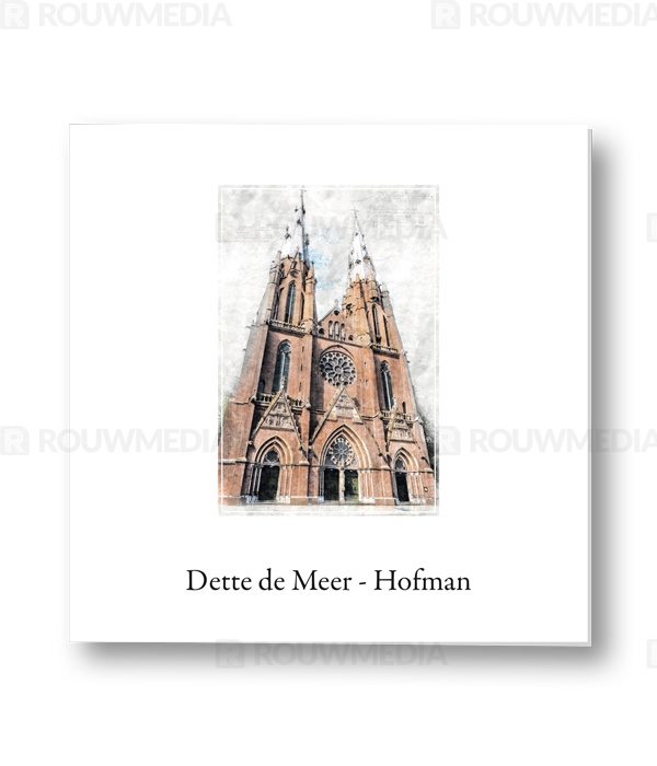 Deze rouwkaart maakt onderdeel uit van de reeks schets afbeeldingen. Op deze kaart wordt de Sint-Catharinakerk weergegeven. Onder de schets kan de naam en datums worden getoond.
