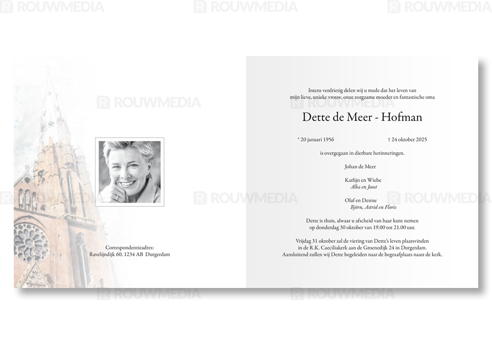 Deze rouwkaart maakt onderdeel uit van de reeks schets afbeeldingen. Op deze kaart wordt de Sint-Catharinakerk weergegeven. Onder de schets kan de naam en datums worden getoond.