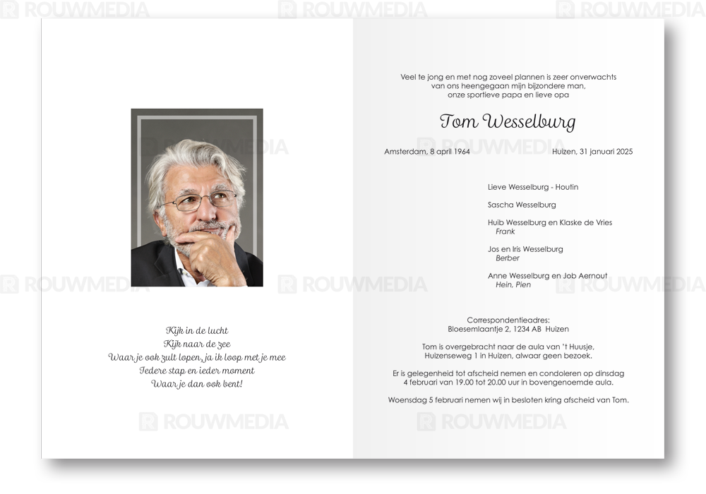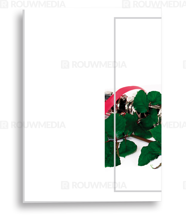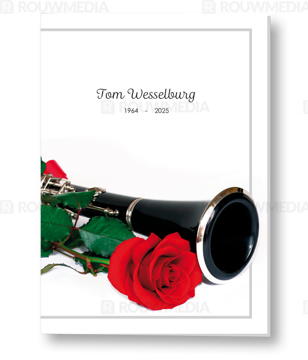 In de staande rouwkaart wordt een beeldvullende foto weergegeven van een clarinet met rode roos.