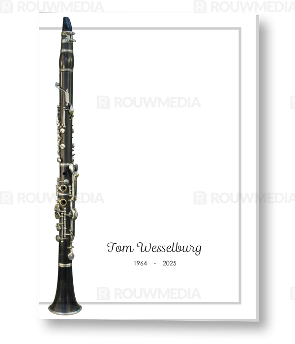 In de staande rouwkaart wordt een beeldvullende foto weergegeven van een clarinet met rode roos.