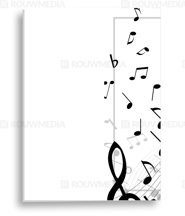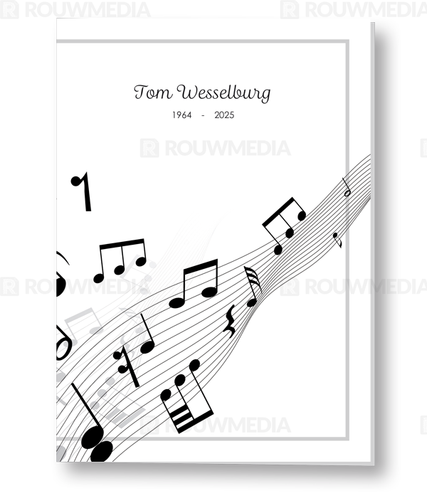In de staande rouwkaart wordt een beeldvullende foto weergegeven van dansende muzieknoten op een notenbalk.