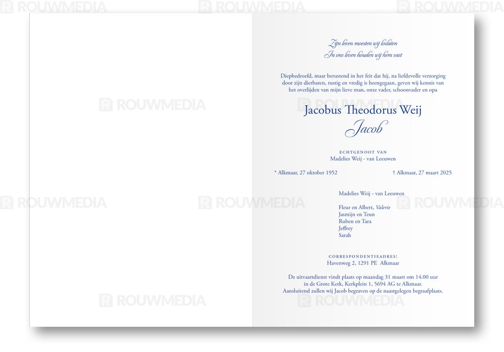 In deze recht staande kaart wordt een afbeelding weergegeven een tekening met pen van de Waag Alkmaar. Daarnaast is het mogelijk om de naam, data en gedicht/citaat weer te geven.