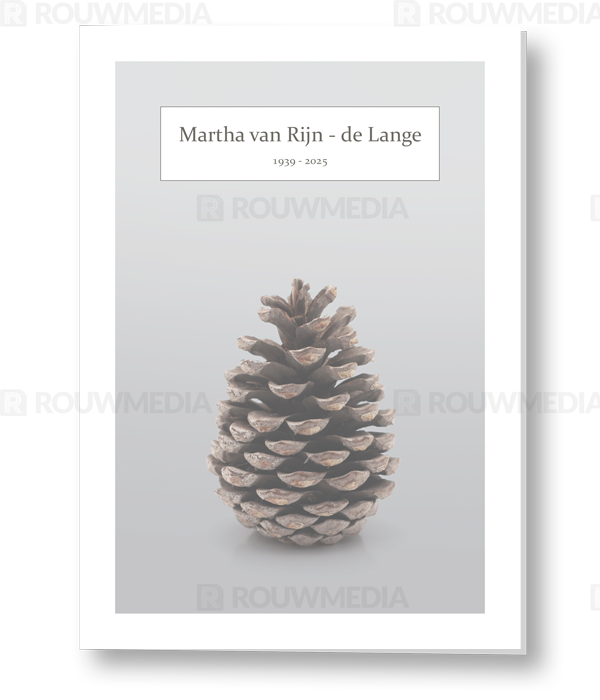 In de staande rouwkaart wordt een beeldvullende foto weergegeven van een denneappel.