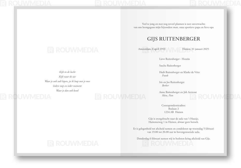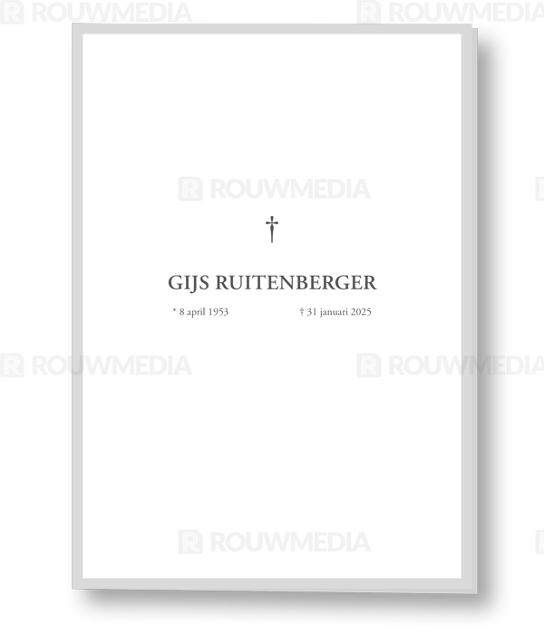 Staande rouwkaart met dik grijs kader en kruis in het midden.
