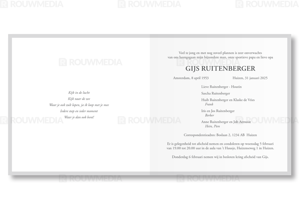 Vierkante rouwkaart met dik grijs kader en kruis in het midden.