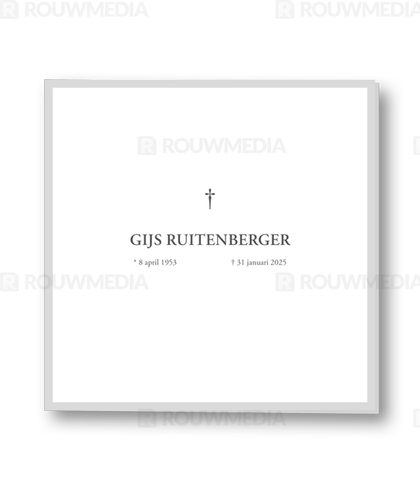 Vierkante rouwkaart met dik grijs kader en kruis in het midden.