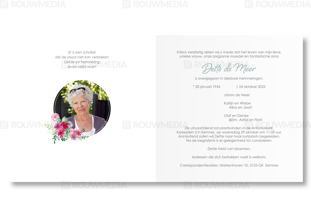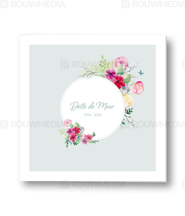In deze vierkante rouwkaart wordt de naam en datums van de overledenen centraal gezet. Door een ronde cirkel met vleurige bloemen wordt de naam extra geaccentueerd.