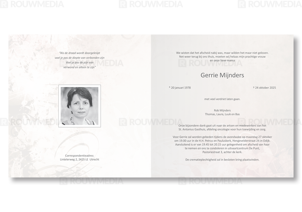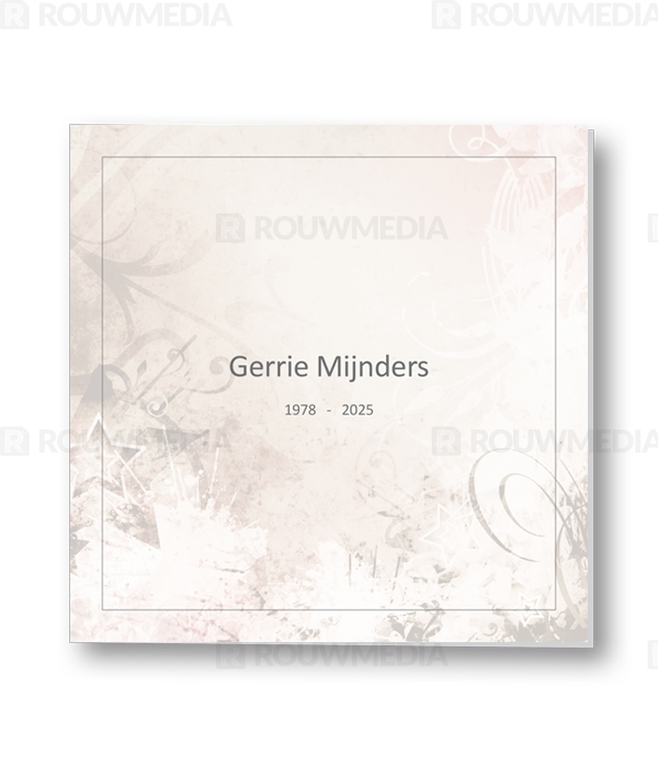 In deze vierkante rouwkaart is met de hulp van diverse texturen een beeldvullend stijl ontstaan waarin het mogelijk is om de naam en datums gecentreerd weer te geven.