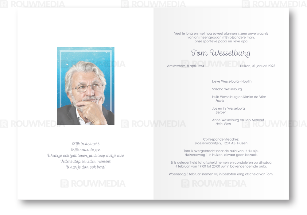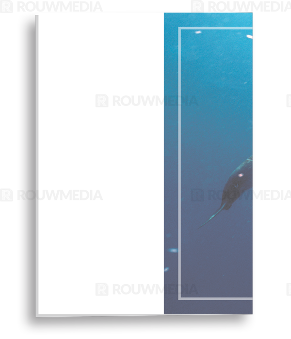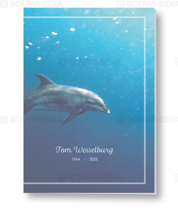 In de staande rouwkaart wordt een beeldvullende foto weergegeven van een dolfijn in de zee.