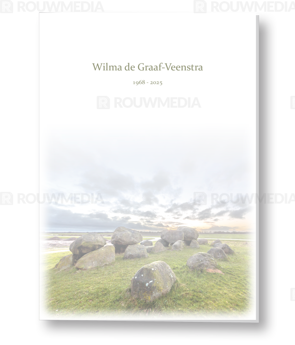In deze staande rouwkaart wordt een beeldvullende afbeelding weergegeven van de Drenthse Hunebedden. Boven de afbeelding kunt u de naam en datums weergeven.