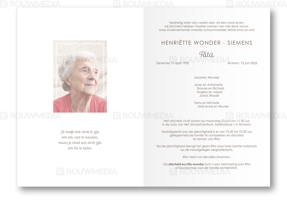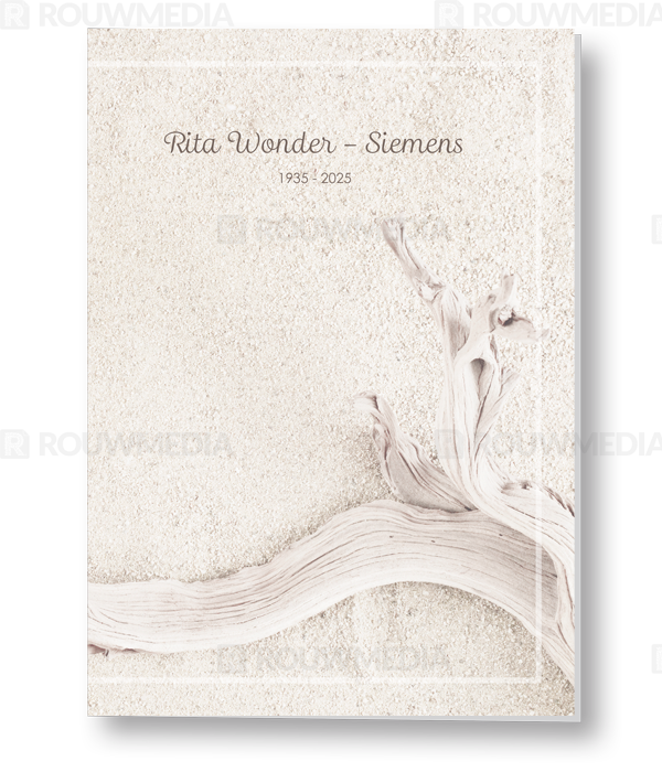 In de staande rouwkaart wordt een beeldvullende foto weergegeven van een stuk drijfhout op het zand.
