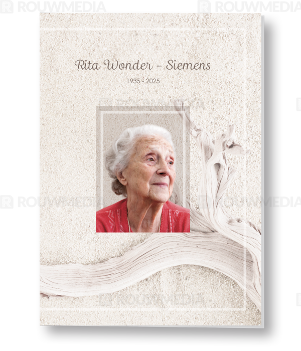 In de staande rouwkaart wordt een beeldvullende foto weergegeven van drijfhout op het zand. Daarnaast is het mogelijk om een portret/foto naar eigen keuze rechts weer te geven naast de naam en datums.