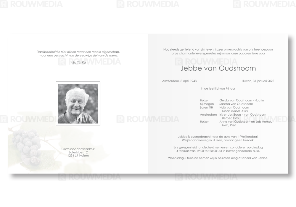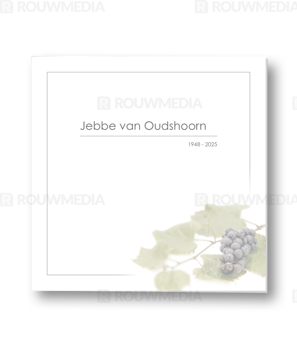 Deze vierkante rouwkaart toont in een simpele stijl hoe een afbeelding de focus kan krijgen in een kaart, maar wel de serene rust bewaart. Voor deze kaart is er gekozen voor een druiventros aan blad.