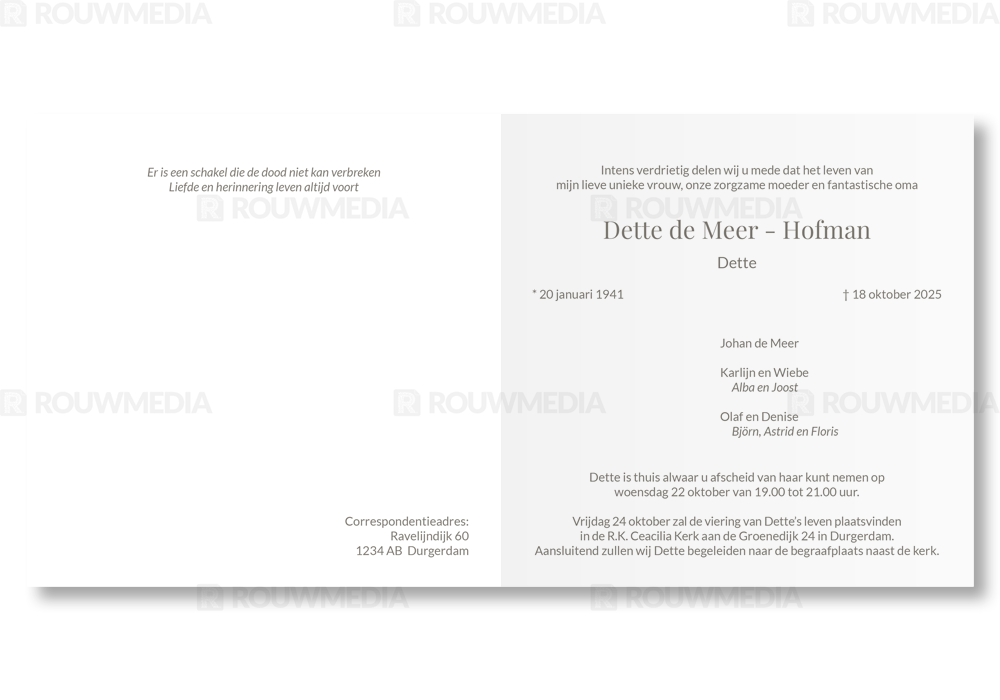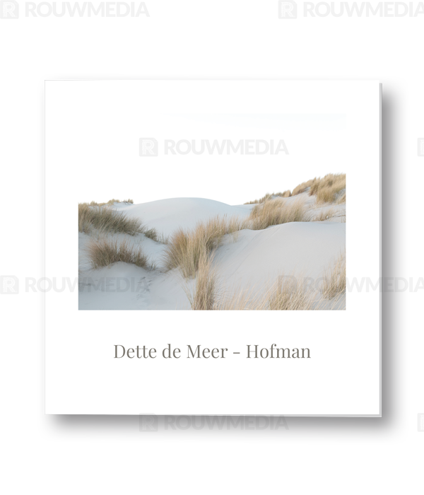 In deze rouwkaart is een afbeelding van de duinen weergegeven. Door de afbeelding over vrijwel de gehele breedte weer te geven ontstaat er een rustige en serene sfeer.