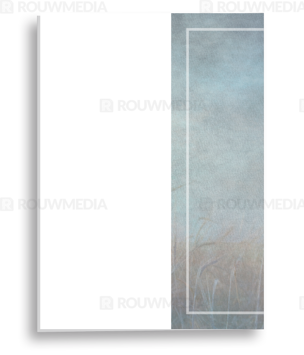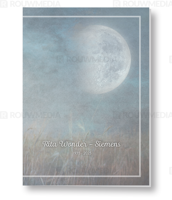 In de staande rouwkaart wordt een beeldvullende foto weergegeven van een korenveld in de nacht met een volle maan.