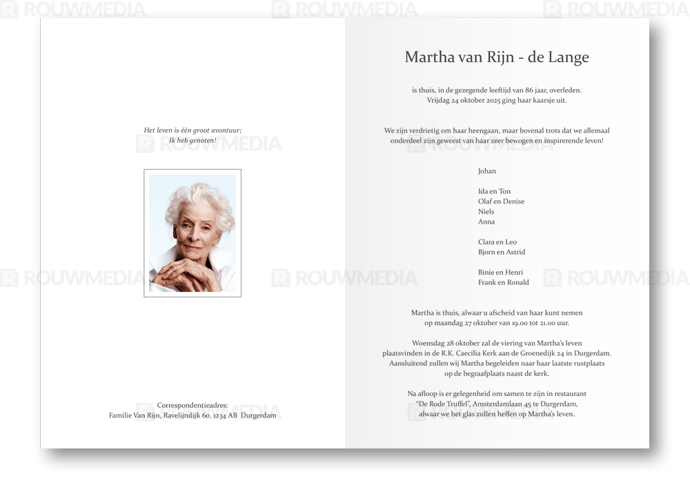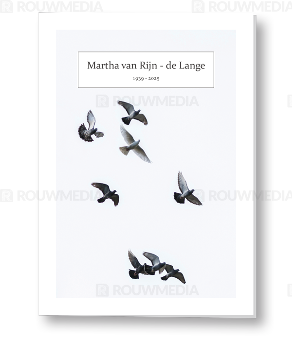 In de staande rouwkaart wordt een beeldvullende foto weergegeven van vliegende duiven.