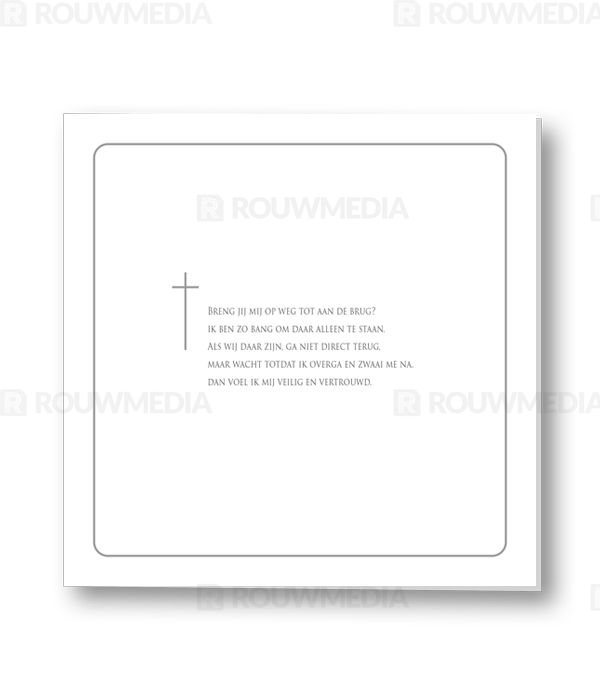 Rouwkaart met grijs rond kader en kruis in het midden. Er is ruimte voor een gedicht, bijbeltekst of citaat.