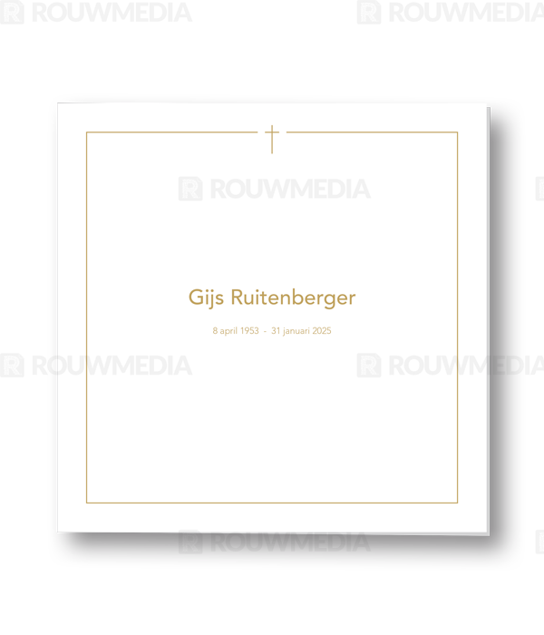 Rouwkaart met goud kader en kruis boven gecentreerd. Naam kan midden in de Rouwkaart geplaatst worden.