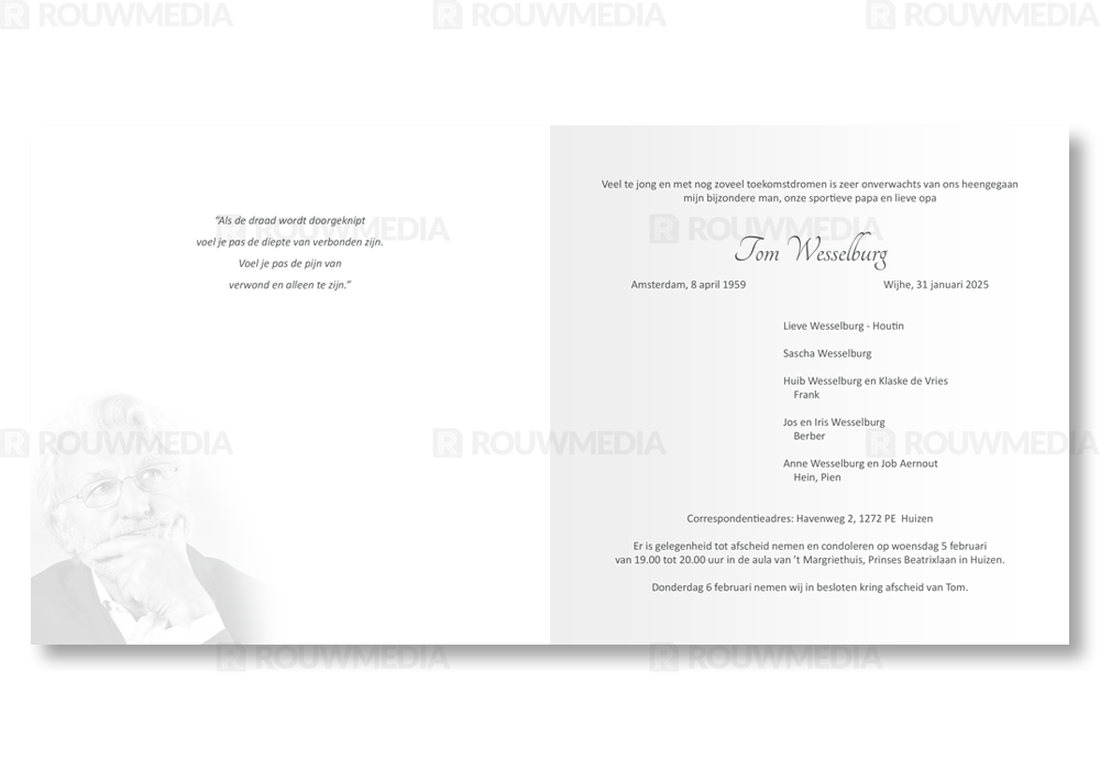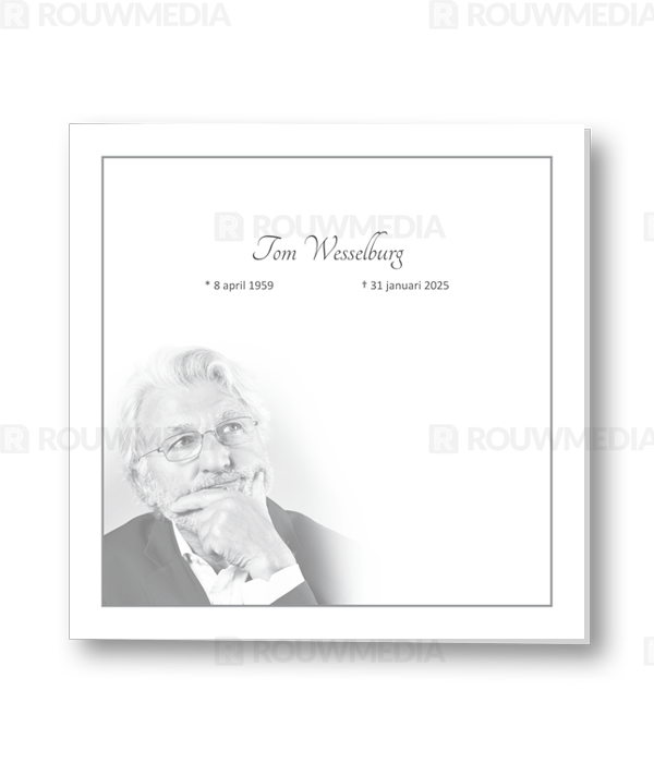 Rouwkaart met grijs kader. Er is ruimte voor een portret of andere eigen afbeelding.