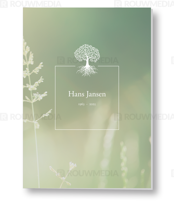In deze staande kaart wordt een wit grijs kader in het midden onderbroken door een boom. Binnen dit kader kan de naam met datum worden weergegeven. Op de achtergrond wordt een beeldvullende afbeelding getoond.
