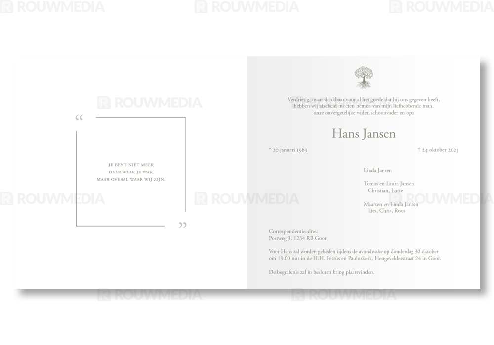 Rouwkaart met dun kader en boom