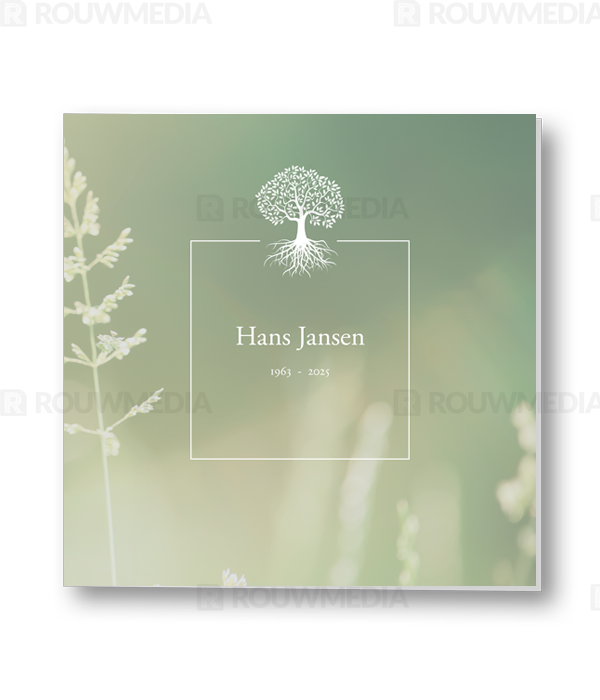 In deze vierkante kaart wordt een wit grijs kader in het midden onderbroken door een boom. Binnen dit kader kan de naam met datum worden weergegeven. Op de achtergrond wordt een beeldvullende afbeelding getoond.