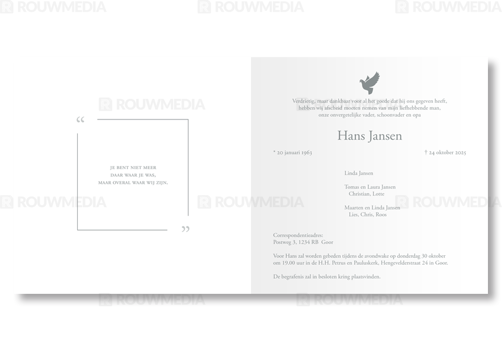 Rouwkaart met dun kader en duif