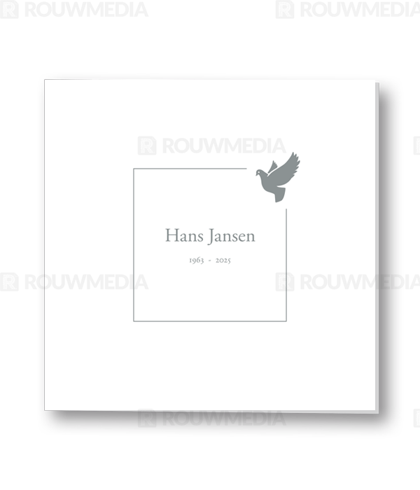In deze vierkante kaart wordt een dun grijs kader in de rechterhoek onderbroken door een duif. Binnen dit kader kan de naam met datum worden weergegeven.