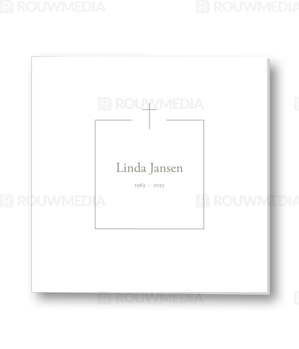 In deze vierkante kaart wordt een dun grijs kader in het midden onderbroken door een kruis. Binnen dit kader kan de naam met datum worden weergegeven.