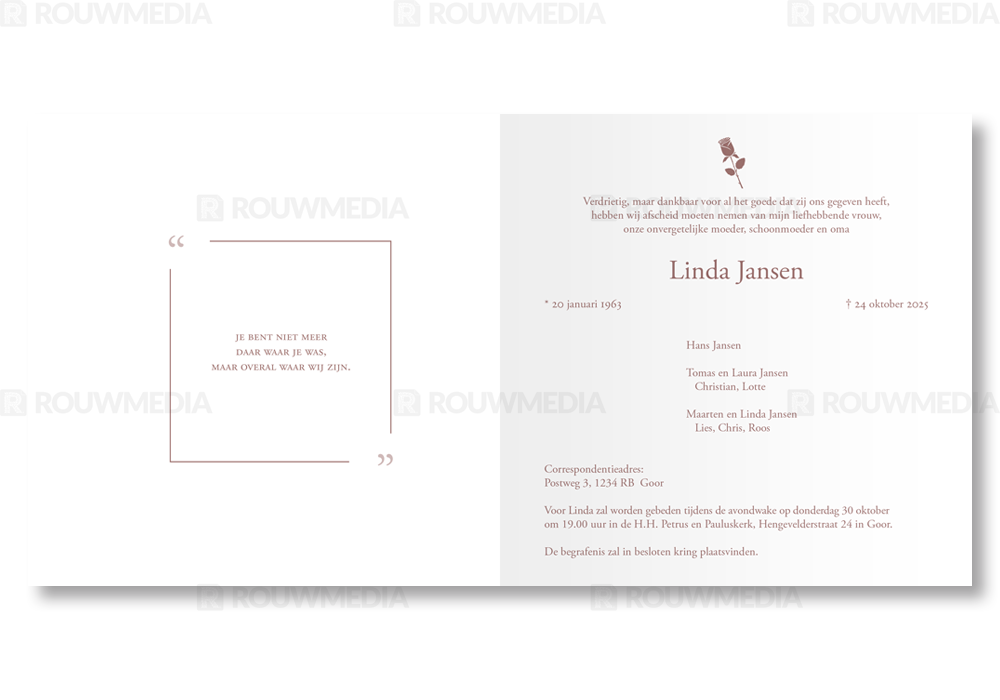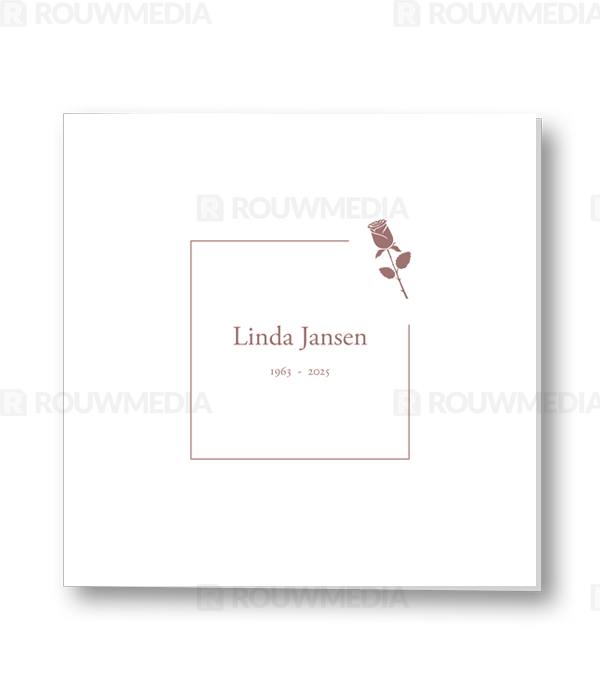 In deze vierkante kaart wordt een dun grijs kader in de rechterhoek onderbroken door een rode roos. Binnen dit kader kan de naam met datum worden weergegeven.