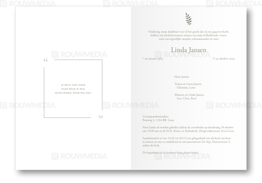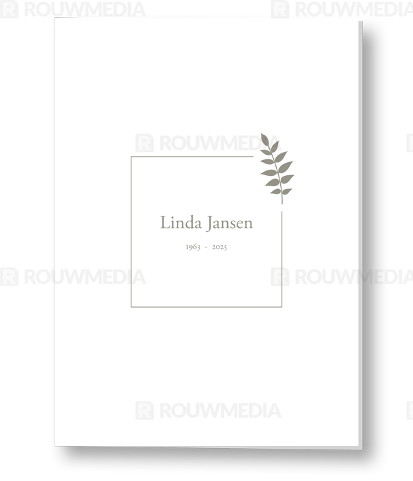 In deze staande kaart wordt een dun grijs kader in de rechterhoek onderbroken door een takje. Binnen dit kader kan de naam met datum worden weergegeven.