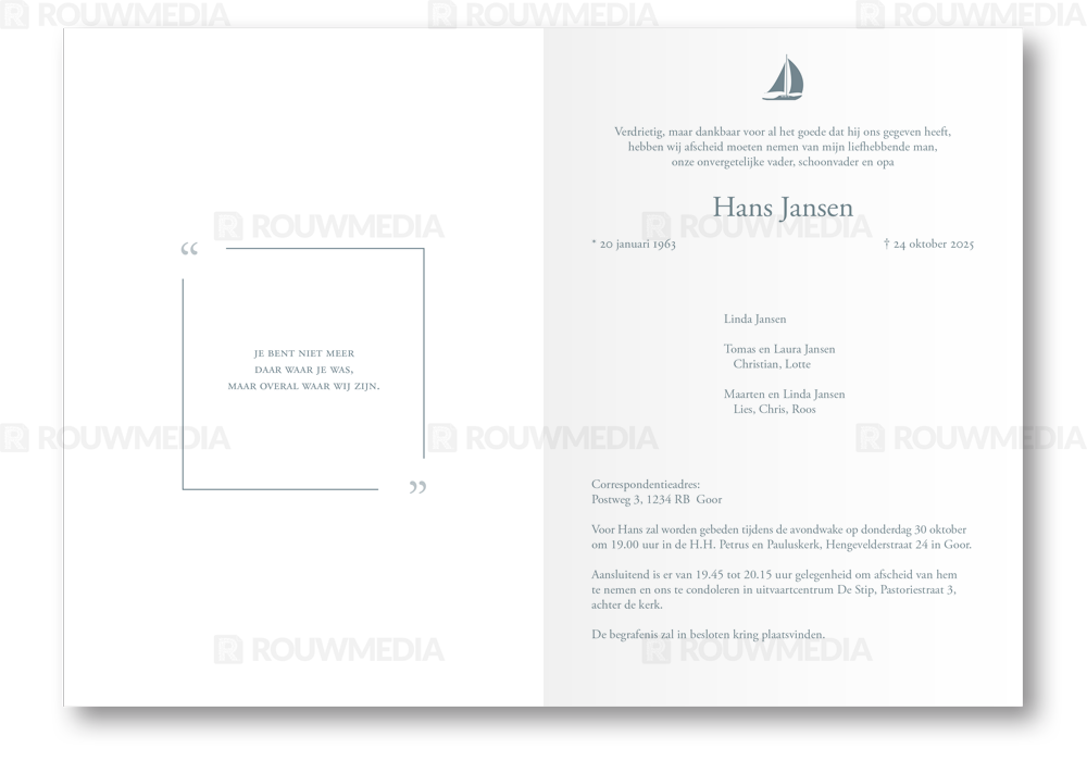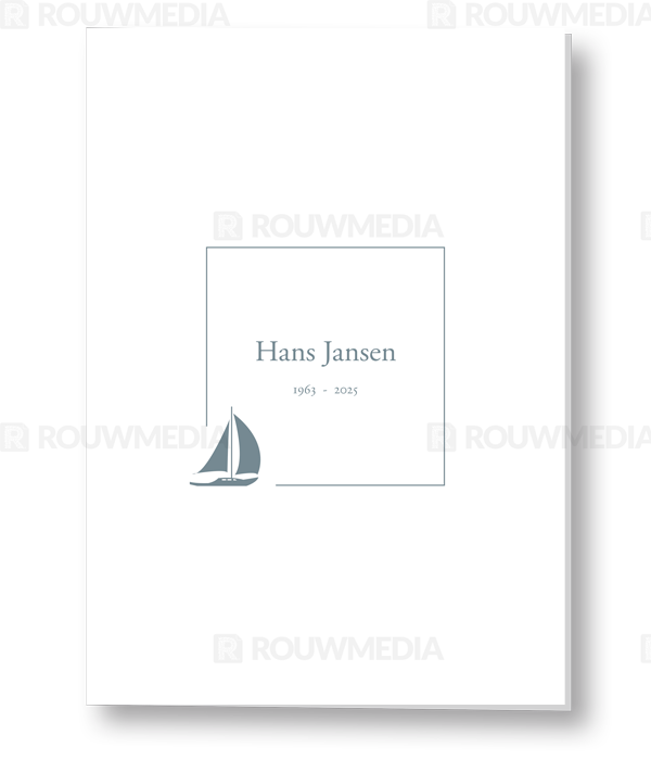 Rouwkaart met dun kader en zeilboot
