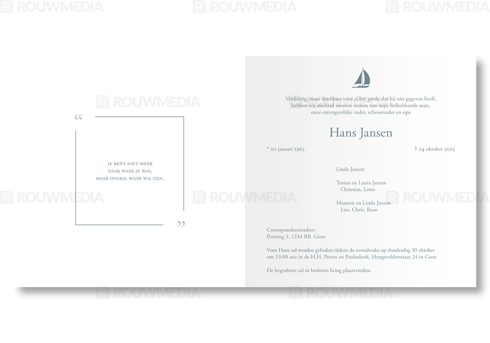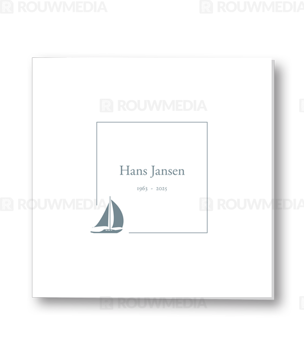 Rouwkaart met dun kader en zeilboot