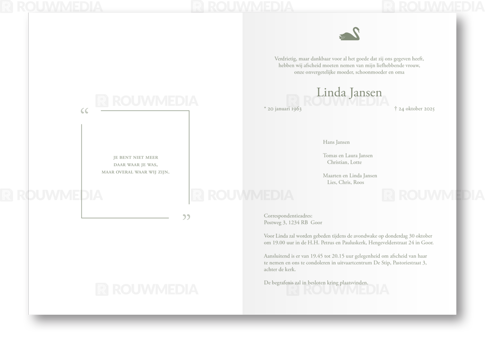 In deze staande kaart wordt een dun grijs kader in de rechterhoek onderbroken door een zwaan. Binnen dit kader kan de naam met datum worden weergegeven.
