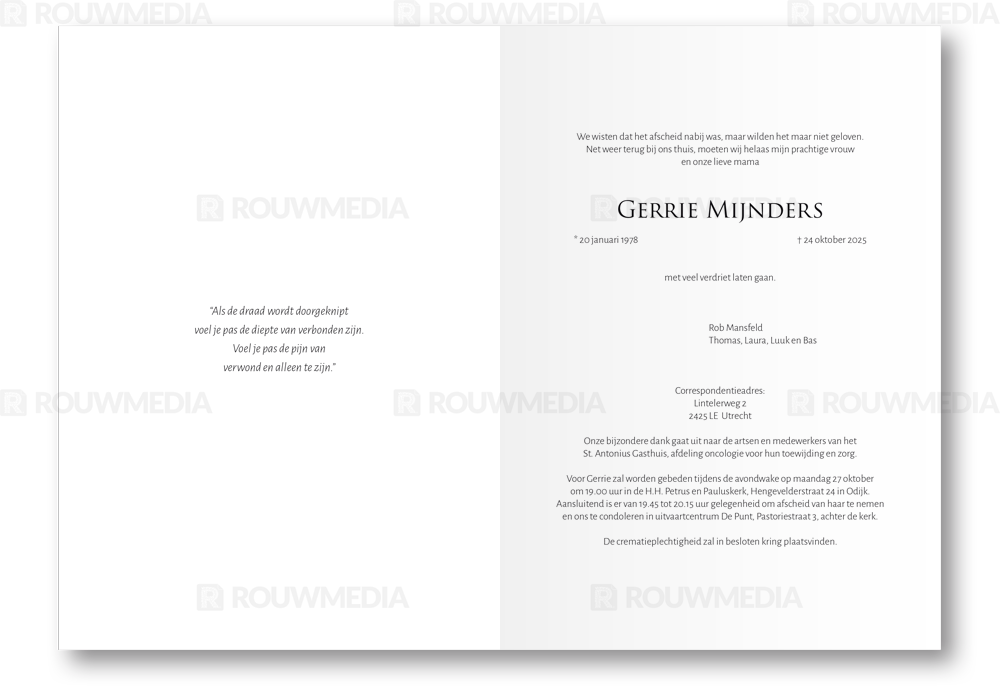 Rouwkaart met zwart rond kader en kruis in het midden. Er is ruimte voor een gedicht, bijbeltekst of citaat.