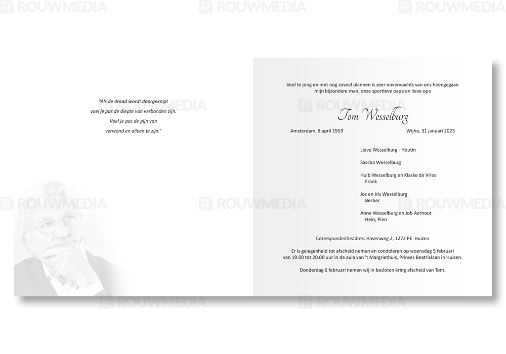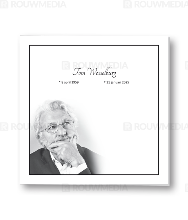 Rouwkaart met zwart kader. Er is ruimte voor een portret of andere eigen afbeelding.