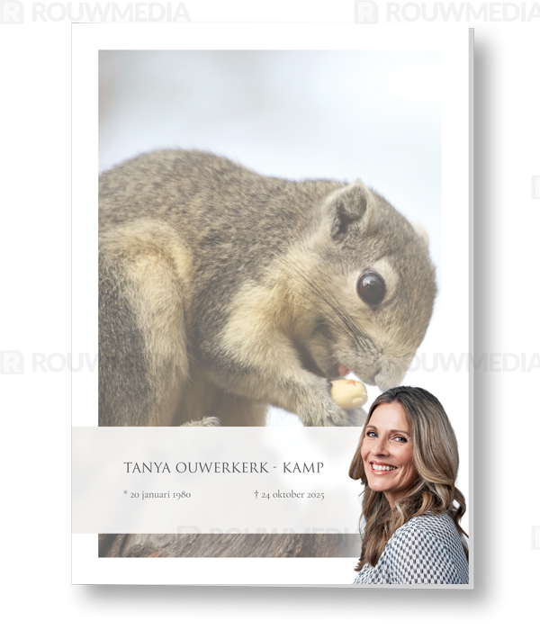 In de staande rouwkaart wordt een beeldvullende foto weergegeven van een eekhoorntje. Daarnaast is het mogelijk om een portret/foto naar eigen keuze rechts weer te geven naast de naam en datums.