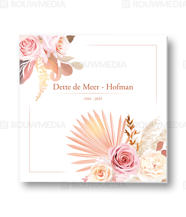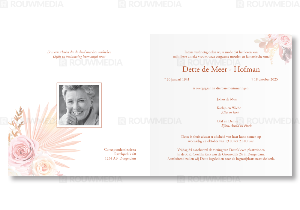 Op deze kaart wordt een illustratie van een roze boeket weergegeven, aan de binnenzijde van de kaart kan een portretfoto worden geplaatst met een kader eromheen.