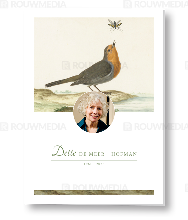Rouwkaart met een schilderij van een roodborst