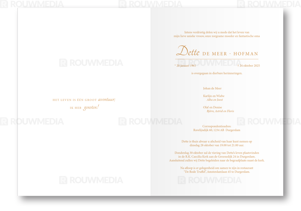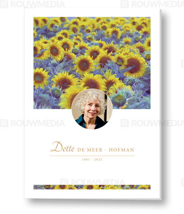 Rouwkaart met een schilderij van zonnebloemen en foto
