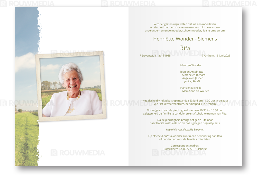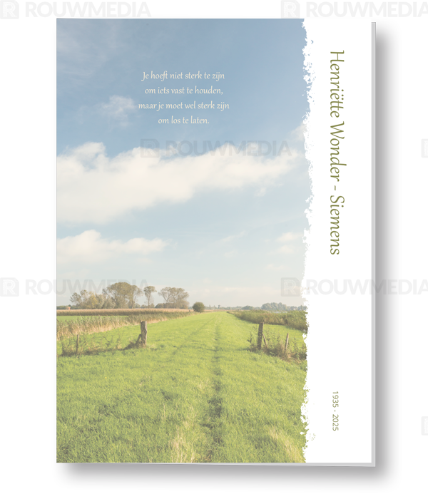 In deze rechthoekige rouwkaart wordt een beeldvullende afbeelding weergegeven van een weide. Daarnaast is het mogelijk om de naam, datums en gedicht/citaat weer te geven.