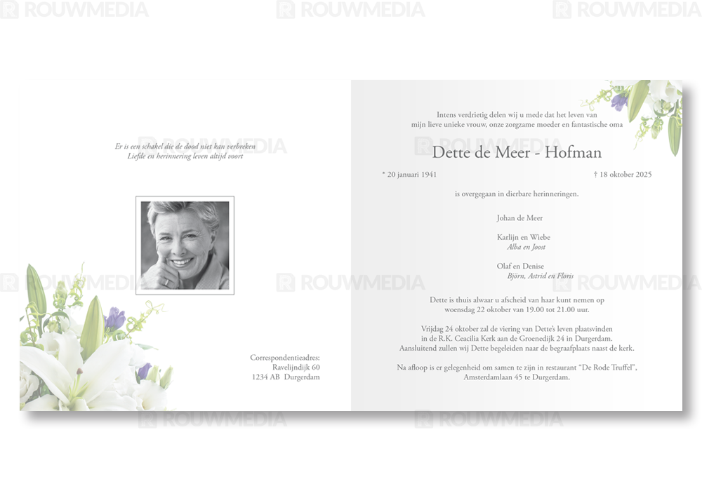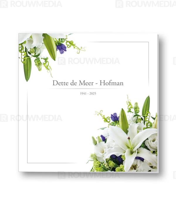 Op deze kaart wordt een wit met paars boeket weergegeven, aan de binnenzijde van de kaart kan een portretfoto worden geplaatst met een kader eromheen.